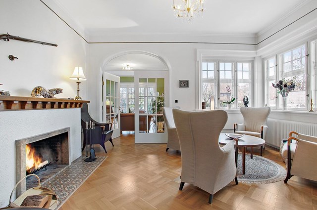 Villaen rummer en række herskabelige værelser, herunder et rummeligt master-bedroom med tilhørende walk-in closet og et stemningsfuldt herreværelse med bar og plads til et poolbord. Derudover byder boligen på en storslået stue med direkte adgang til terrassen, en spisesal med fine, originale detaljer og adskillige hyggelige kroge, der indbyder til afslapning.