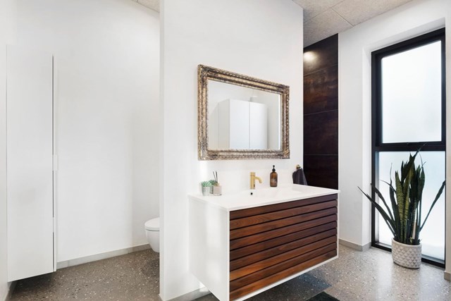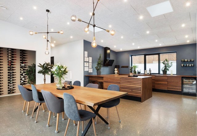Boligen er designet af ejerne i samarbejde med en arkitekt og er opført i holdbare kvalitetsmaterialer. Gennemgående gulve med indlagt gulvvarme, rigelige spotlys med lysdæmpningsfunktion og Troldtekt-lofter, der sikrer behagelig akustik, bidrager til hjemmets luksuriøse fornemmelse. Farvevalget med naturnuancer på væggene og det smukke Tvis-køkken i valnøddetræ understøtter den harmoniske atmosfære.