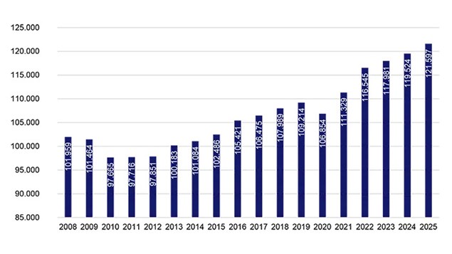 Efter et fald i antallet af beskæftigede lønmodtagere i perioden 2008-2010, har Aalborg oplevet en generel stigning, afbrudt kun af nedgangen i 2020 som følge af Covid-19. Siden 2020 er beskæftigelsen igen vokset, og ved udgangen af 2. kvartal 2025 var antallet af beskæftigede nået en ny rekord på 121.597 personer i virksomhederne i Aalborg.