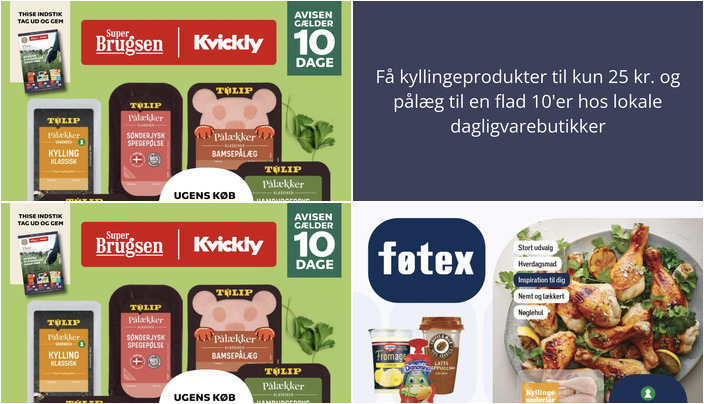 Føtex tilbyder et udvalg af kyllingeprodukter, herunder kyllinge underlår, kyllingestrimler og kyllingeoverlår uden ben til kun 25 kr. pr. pakke. Tilbuddet gælder fra tirsdag d. 7. april til torsdag d. 16. april.