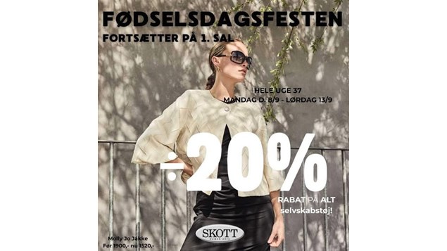 Efter en uge med fødselsdagsrabat i stueetagen fortsætter fejringen hos Skott Aalborg. Fra mandag den 8. september til lørdag den 13. september tilbyder butikken 20% rabat på alt festtøj i afdelingen på 1. sal.