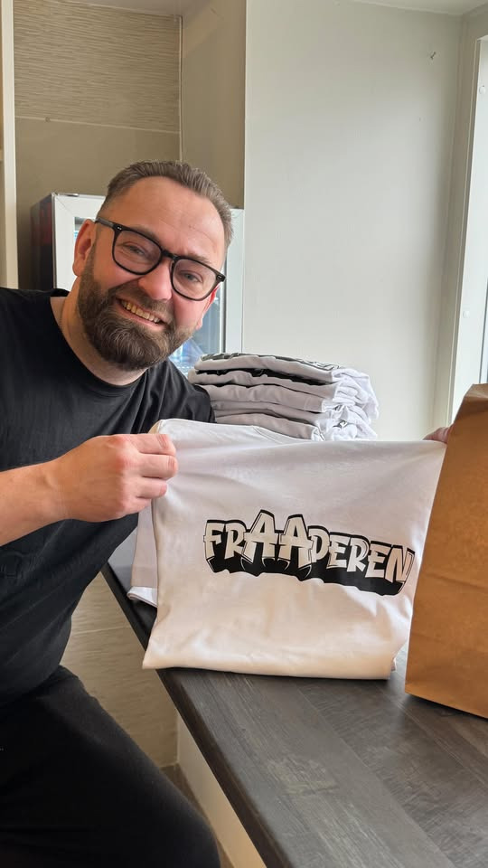 Næste gang I kigger forbi og spiser hos os, skal I bare sige til — så får I en T-shirt med vores logo sammen med jeres bestilling.