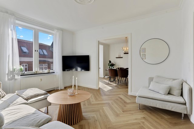 Lejligheden er på 89 kvadratmeter og har gennemgået en omfattende renovering. I entréen mødes man af flotte akustikpaneler og praktisk opbevaring. Herfra åbner boligen sig mod to stuer en suite, hvor klassiske detaljer som stuk og en charmerende karnap i spisestuen giver en særlig atmosfære. Samtidig sikrer store vinduer et fantastisk lysindfald.
