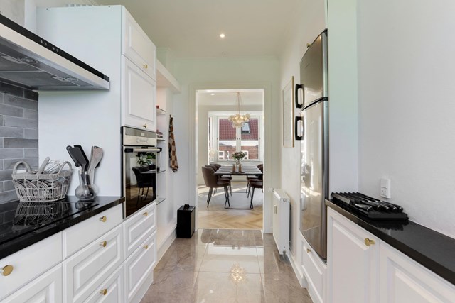 Køkkenet er elegant med hvide fyldningslåger og fine detaljer, der passer til lejlighedens stil. Her er plads til både madlavning og hyggelige stunder. Soveværelset er rummeligt med gode opbevaringsløsninger, mens badeværelset er praktisk indrettet med separat bruseniche.