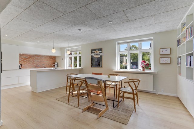 Boligen fremstår indbydende med et moderne køkken-alrum, hvor hvide, grebsfrie fronter og en rå murstensvæg skaber et både tidløst og personligt udtryk. I åben forbindelse ligger opholdsstuen, som sammen med køkkenet bliver boligens naturlige samlingspunkt. Troldtektlofter og et godt lysindfald binder rummene sammen. På stueplan er der desuden et flot badeværelse.