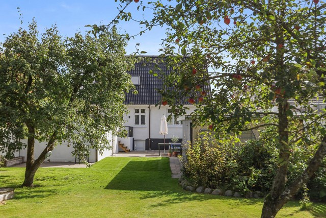 Udendørs byder haven på masser af muligheder: en hævet terrasse, en stor fliseterrasse, frugttræer og flere små kroge, der indbyder til afslapning og samvær. Ejendommen rummer desuden garage og stort udhus.