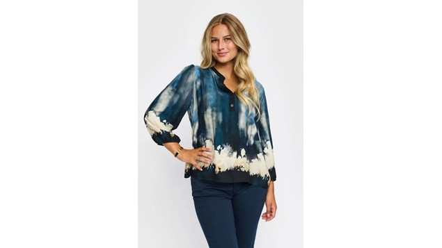 Flot skjortebluse fra 2-Biz med ¾ lange ærmer, rund hals med v-udskæring og stolpelukning i halsen.