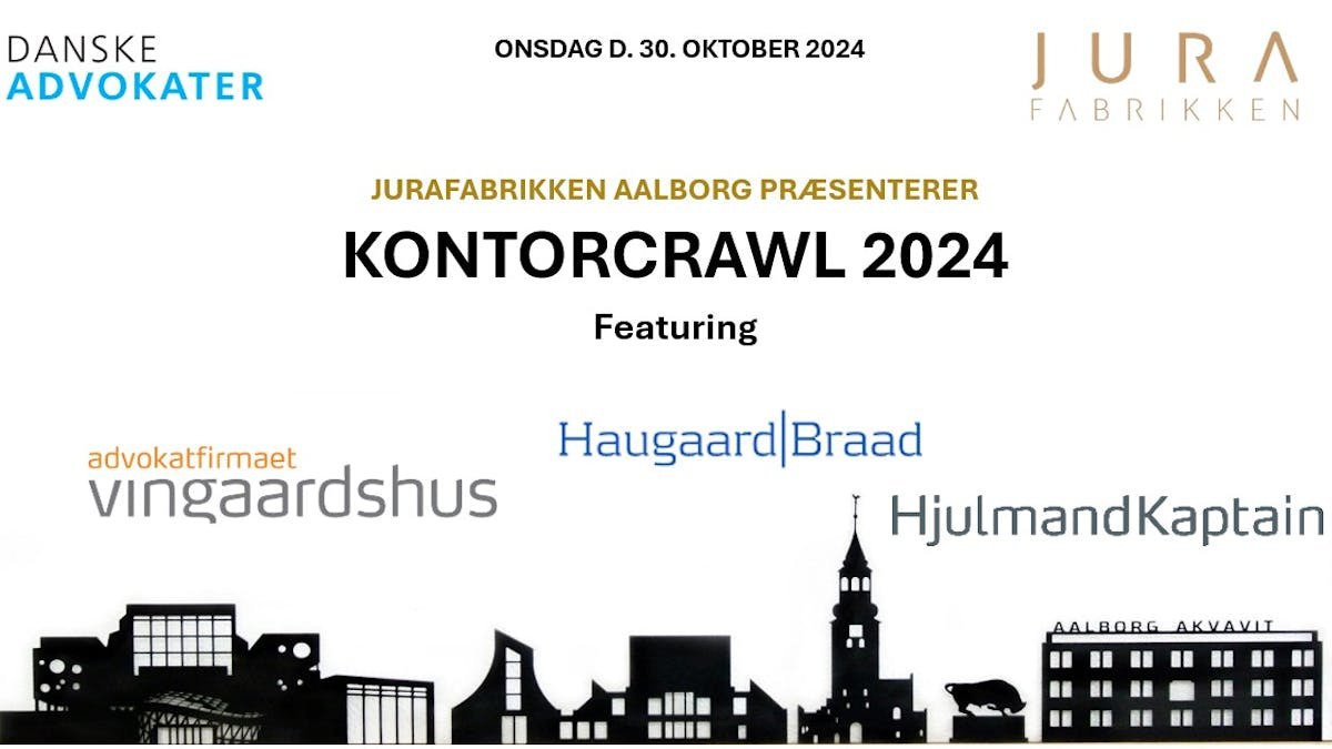 Jurafabrikken Aalborg byder alle interesserede velkommen til en inspirerende aften med Kontorcrawl, hvor tre af byens advokatkontorer åbner dørene for nysgerrige sjæle. Arrangementet starter kl. 16:00 hos Advokatfirmaet Vingaardshus og fortsætter med besøg hos Haugaard Braad og afsluttes hos HjulmandKaptain.
