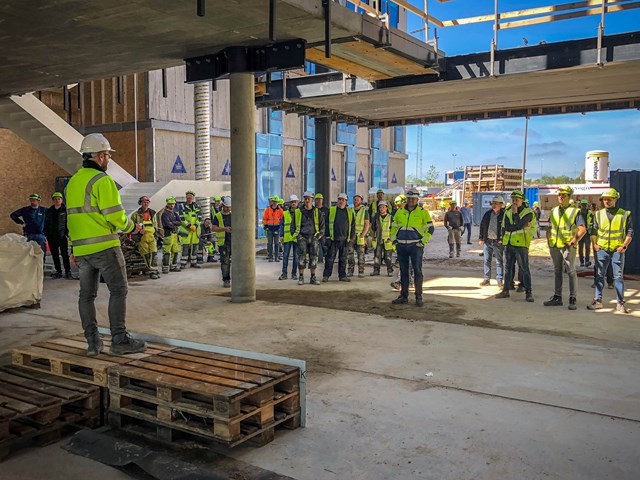 Foto: Vejdirektoratet. Lasse Rud Pedersen, projektleder hos i Vejdirektoratet, holder tale for håndværkerne på byggeriet.