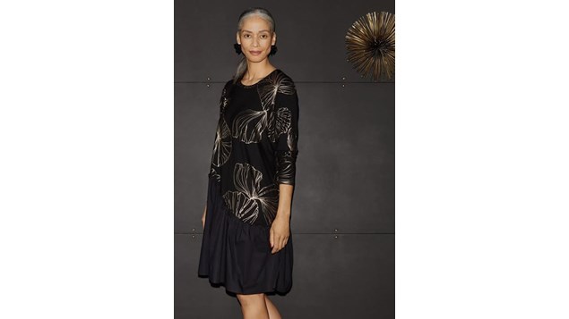 Intet siger fest så tydeligt som guld og glitter – og denne funklende kjole får dig i festhumør på et splitsekund. Den eksklusive jerseykvalitet er dekoreret med et smukt guldprint, og kjolen byder desuden på et asymmetrisk skørt i knitrende bomuld, der giver det helt rigtige sving, når du bevæger dig. Med denne kjole får du både et elegant look og kompromisløs komfort.