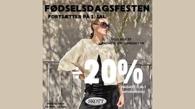 Efter en uge med fødselsdagsrabat i stueetagen fortsætter fejringen hos Skott Aalborg. Fra mandag den 8. september til lørdag den 13. september tilbyder butikken 20% rabat på alt festtøj i afdelingen på 1. sal.