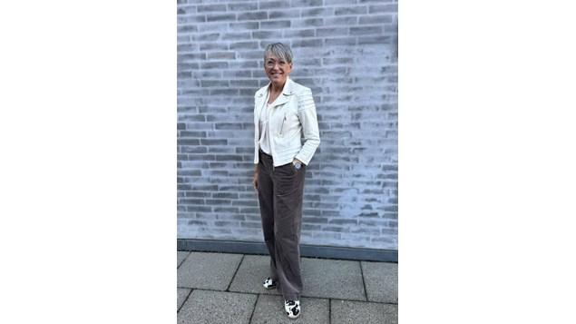 Her er Minna hoppet i den lækkerste jakke fra FRANK LYMAN, samt brede fløjlsbukser fra Part Two. Under jakken en råhvid bluse fra In-Wear.