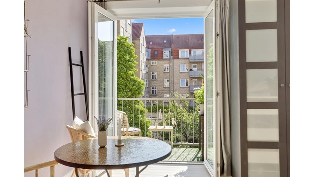 Soveværelset er stort og giver rig mulighed for opbevaring – og som en ekstra bonus har du herfra udgang til en skøn altan, hvor solen kan nydes i mange timer. Badeværelset har et klassisk udtryk med et industrielt twist, lyse fliser, fritlagte rør og en praktisk indbygget væghylde.