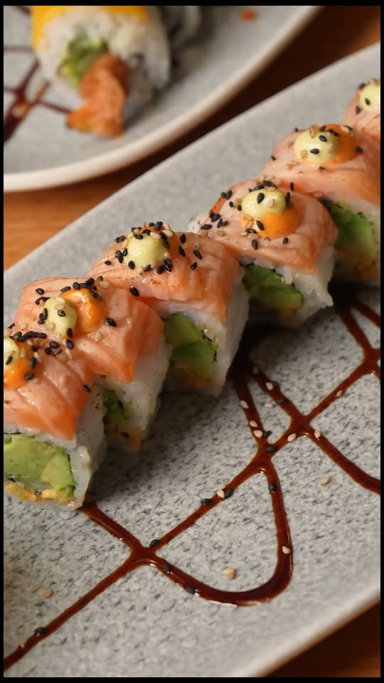 Sprød asparges, cremet avocado og frisk agurk. Toppet med flamberet laks, chili mayo, jalapeños mayo og sesam