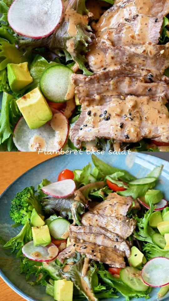 På videoen ser du vores salat med flamberet okse